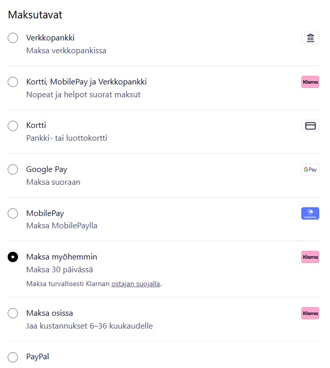 Maksa myöhemmin -valinta antaa vaihtoehdoiksi jatkovalinnan, jossa vaihtoehtona on vähintään "Maksa 30 päivässä". Klarnan voimassaolevien kampanjoiden mukaan valintoja voi olla muitakin, esimerkiksi "Maksa 3. helmikuuta". Nämä ovat Klarnan maksupalveluita, eli Klarna lähettää laskut sinulle. Tarkempia tietoja saat valinnan jälkeen näkyville tulevasta tekstistä ja Ehdot-linkistä.