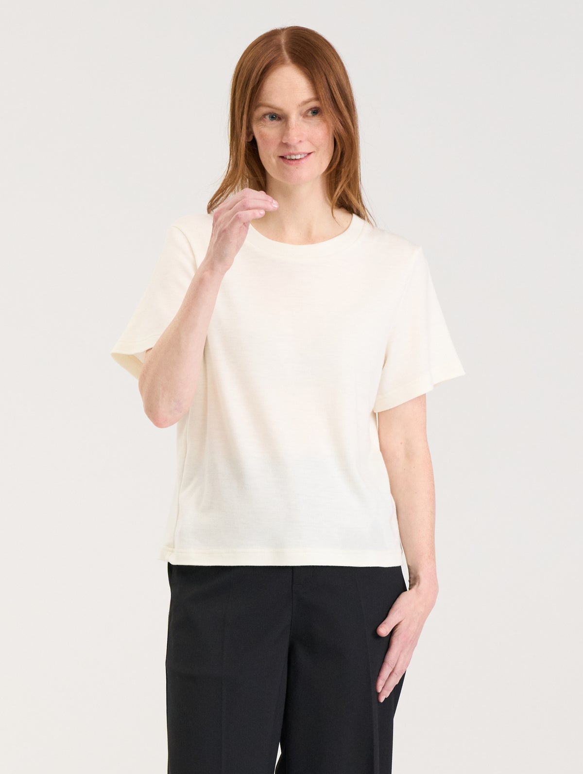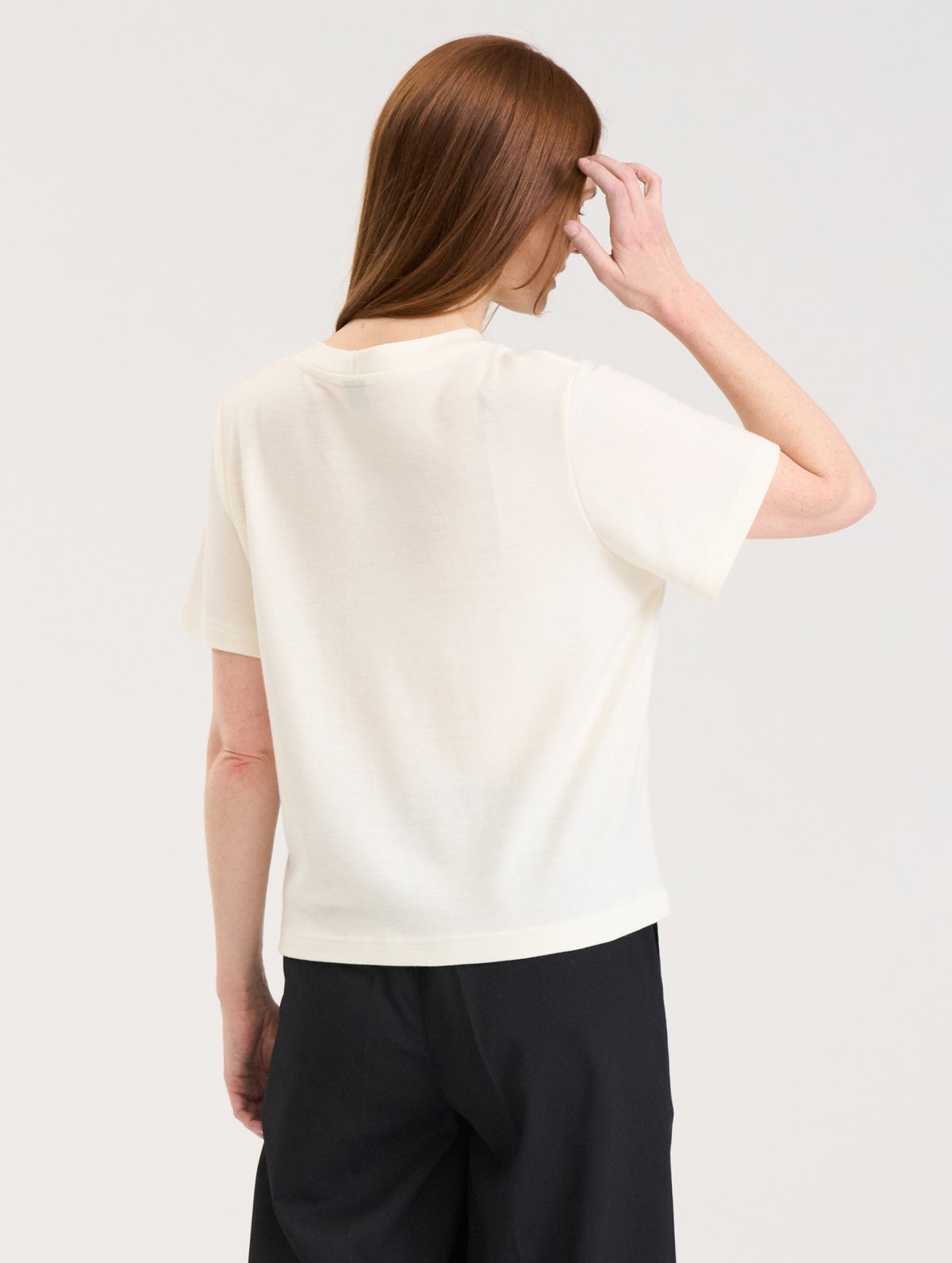 Pehmeästä merinoneuloksesta valmistettu naisten rento T-paita. Pyöreä pääntie.