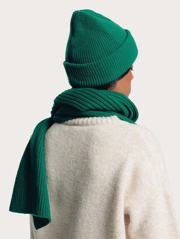 Paksusta villasekoitelangasta valmistettu ribbipipo. Taitettava reunus.