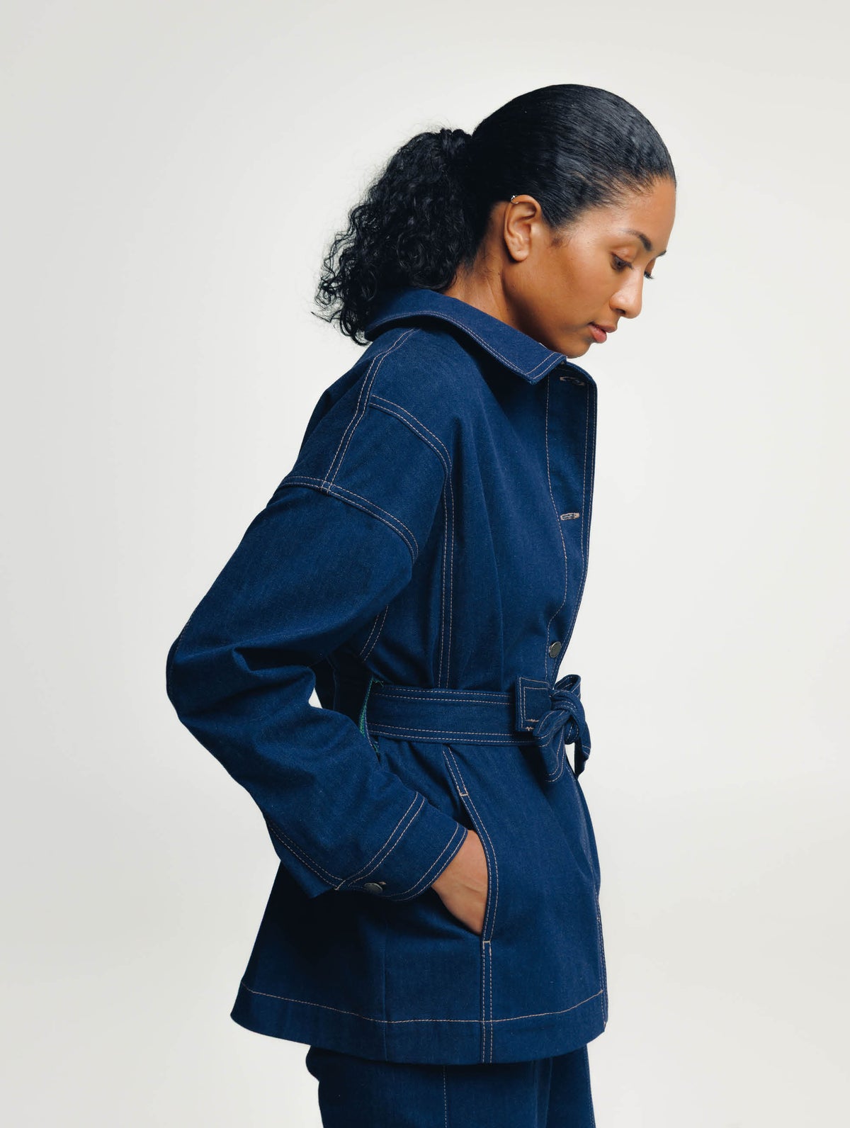Naisten vyöllinen farkkutakki jossa väljä mitoitus ja laskettu olkapää. Edessä nappikiinnitys, hihansuun mansetissa nappikiinnitys ja halkio. Edessä taskut ja sisään ommeltu povitasku, jonka tikkaus näkyy koristeena etukappaleella.