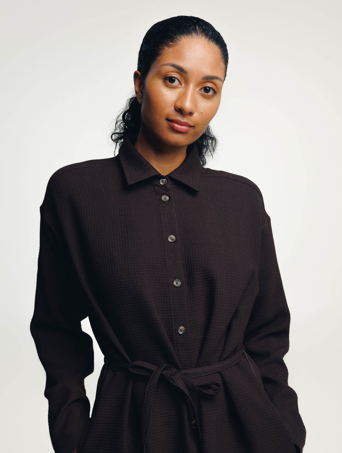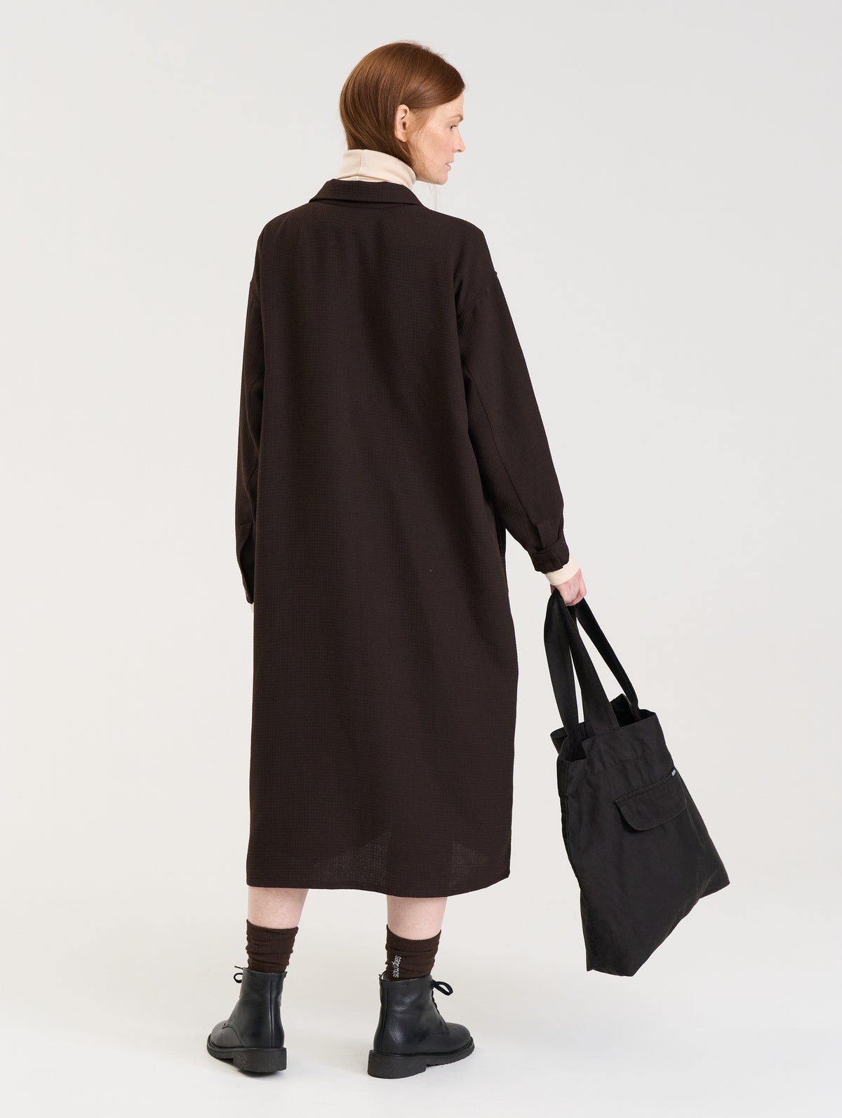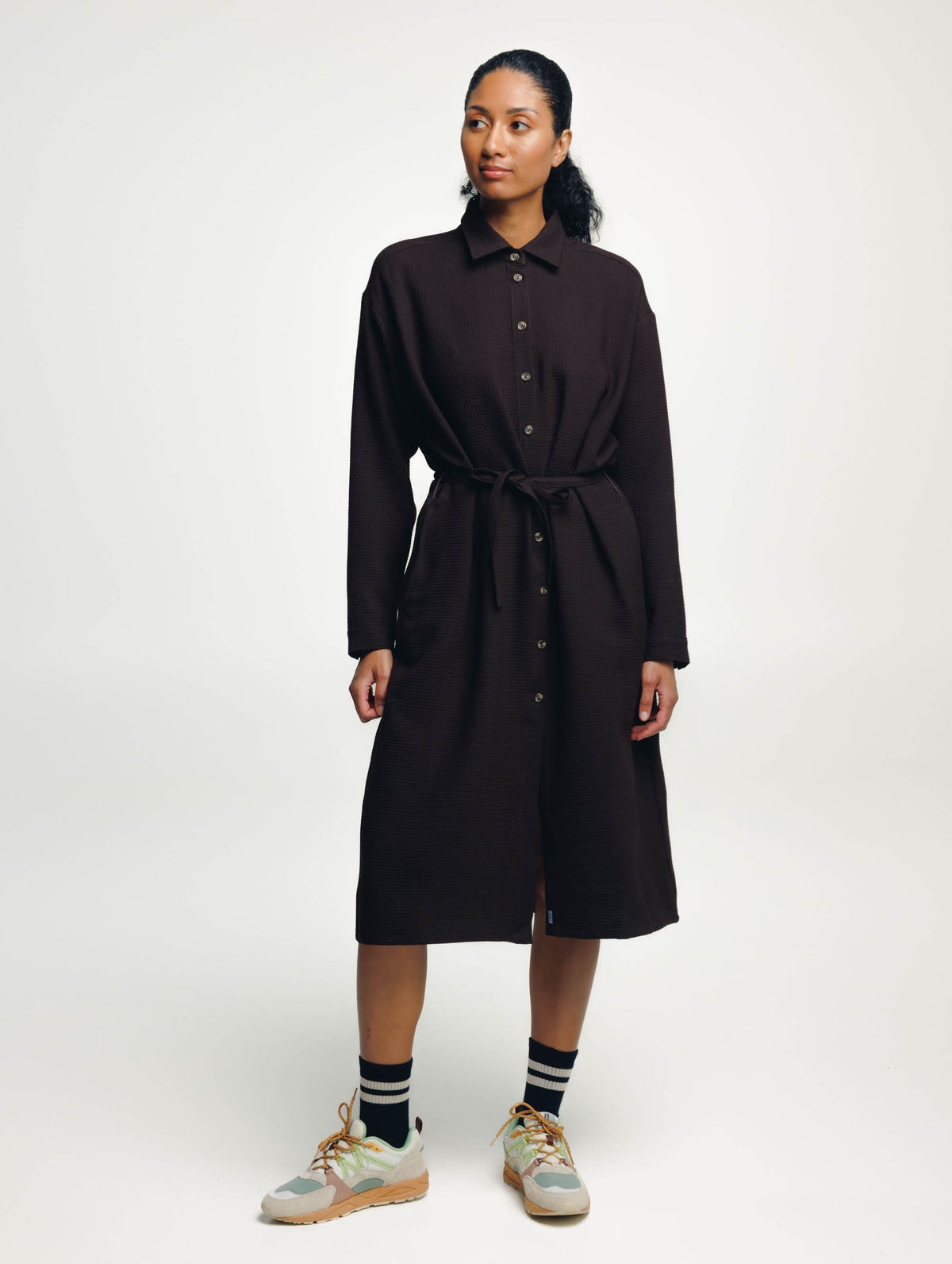 Naisten pitkä villasekoite-vohvelikankaasta valmistettu mekko. Mekossa on vyö ja napit edessä. Taskut sivusaumassa. Pitkät istutetut hihat ja hihansuissa napit.