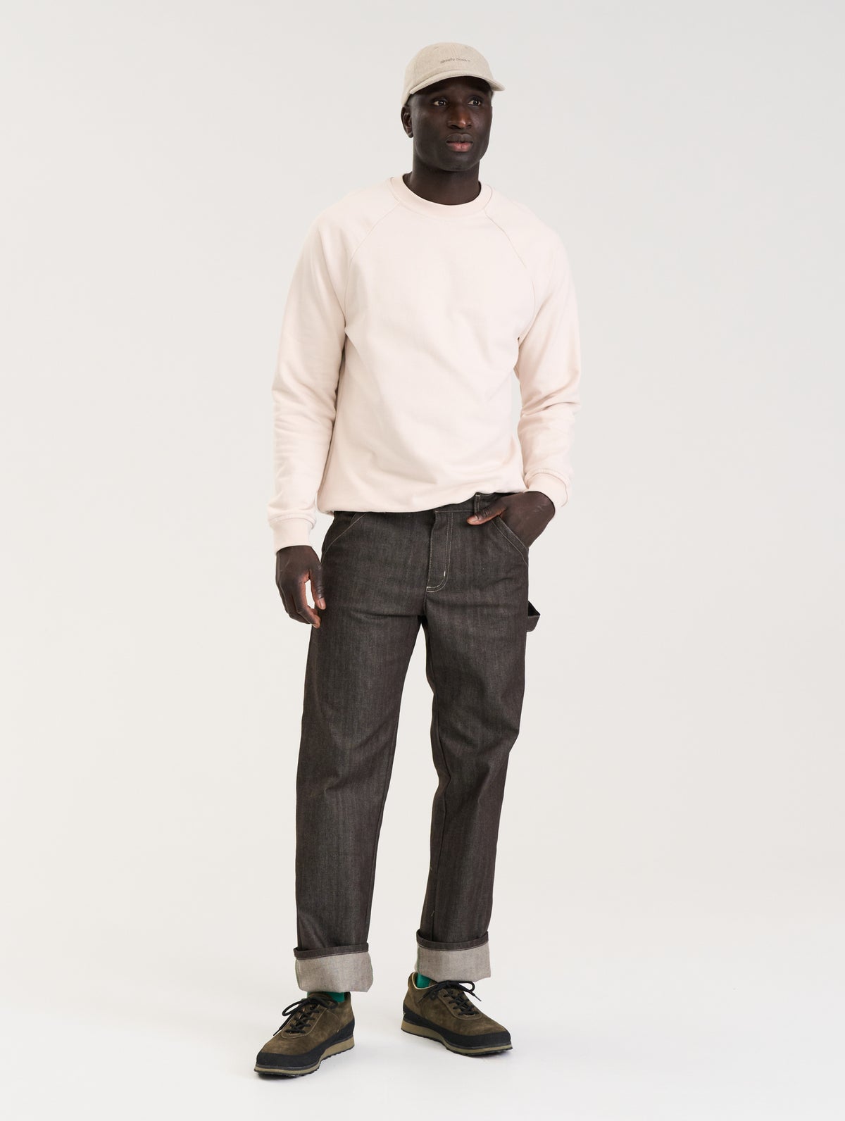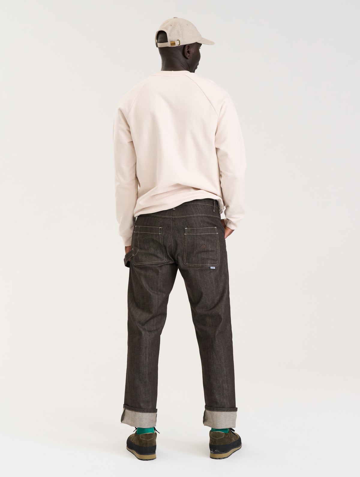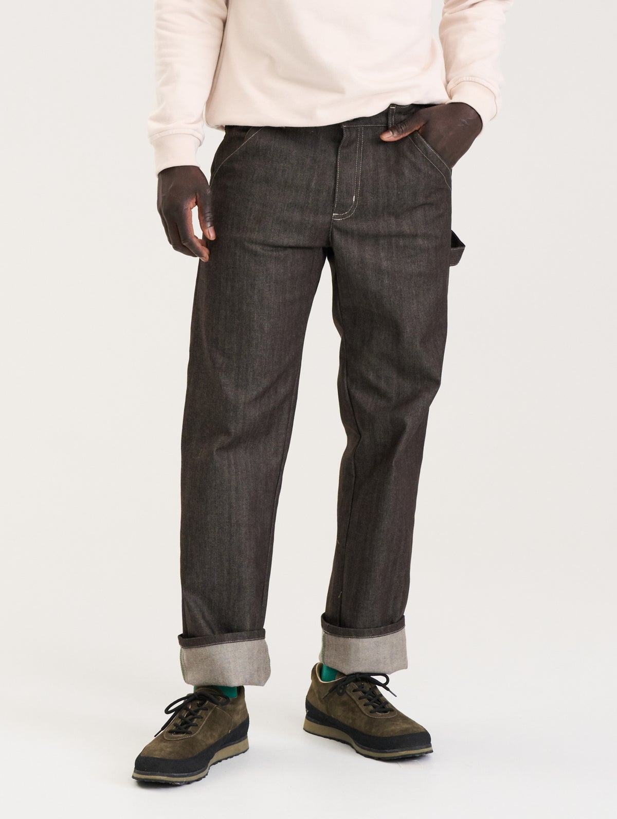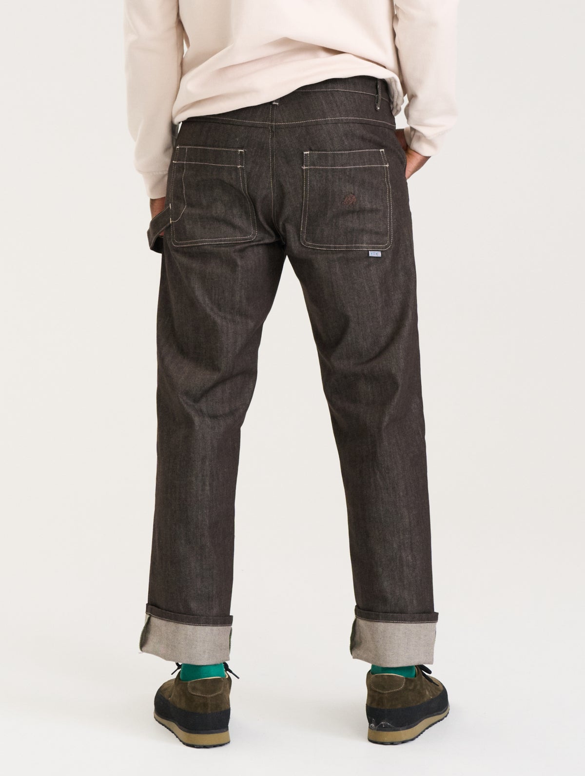 Miesten farkut joissa "worker pants" -henkisiä yksityiskohtia, kuten takana isot paikkataskut ja "vasaralenkki". Takataskussa on brodeeraus sävy sävyyn. Edessä viistotaskut. Farkuissa on edessä vetoketju ja nappikiinnitys ja vyötäröllä vyölenkit. Farkuissa on väljä istuvuus.
