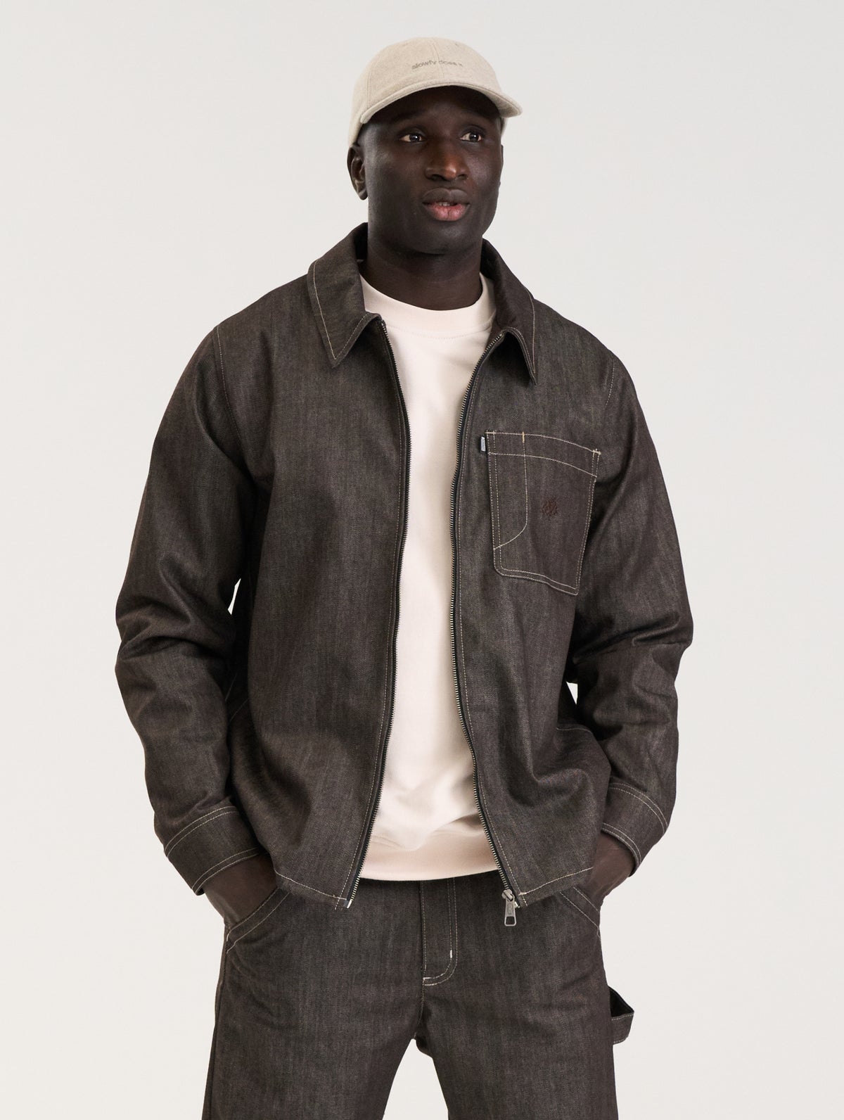 Miesten farkkupusakka jossa on edessä vetoketju, rinnassa paikkatasku sekä taskut sivusaumassa. Rintataskussa on brodeeraus sävy sävyyn. Hihansuussa on nepparisäätö ja halkio.