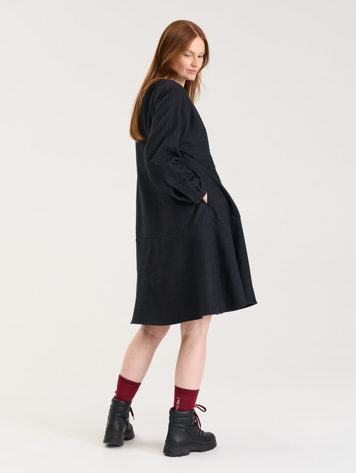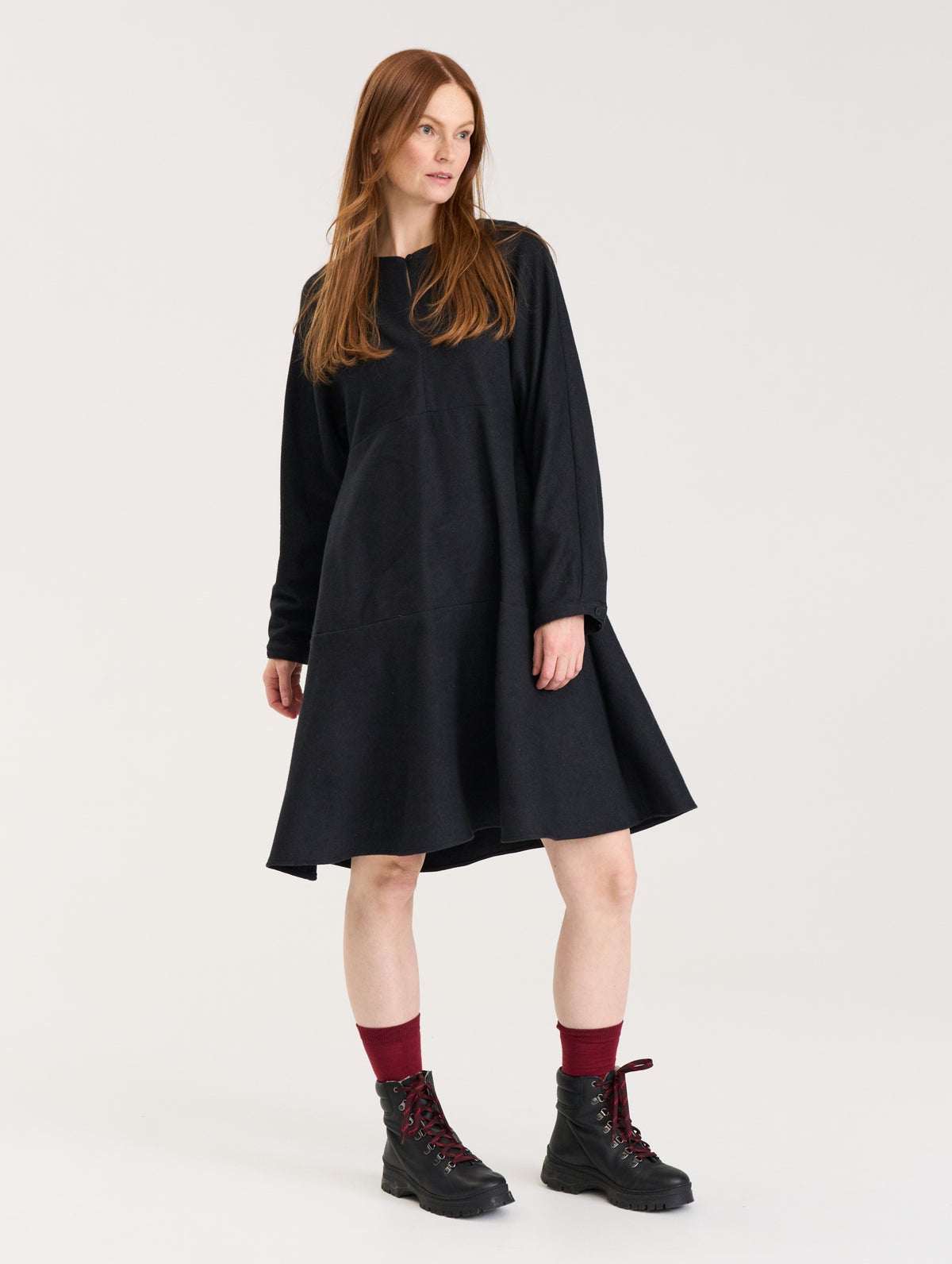 Naisten puolipitkä flanellimekko. Edessä halkio ja nappi sekä pystysauma. Hihansuissa napit säätövaralla. Vyötäröllä sekä helmassa leikkaus ja kellotettu helma. Taskut sivusaumassa.