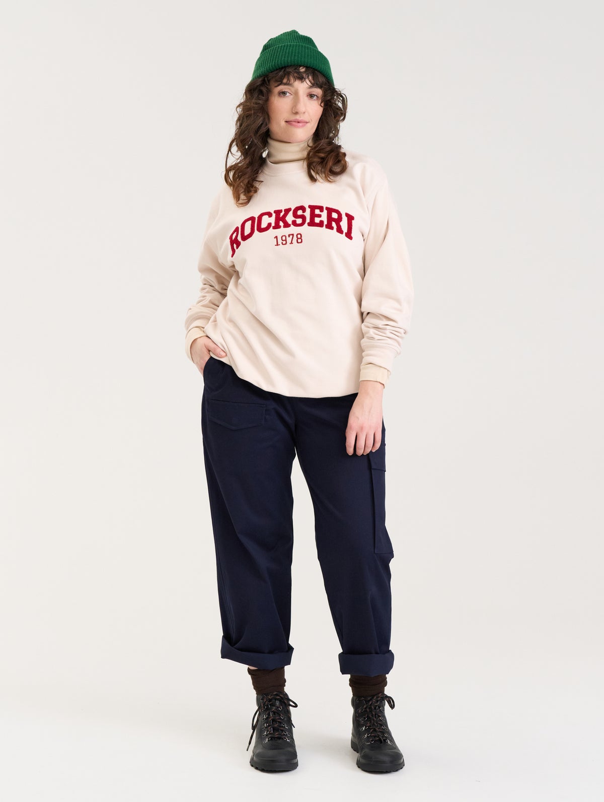 Aika on unisex-mitoituksella tehty väljä collegepaita. Laskettu olkasauma. Resorit pääntiellä, hihansuissa ja helmassa. Rinnassa chenille-brodeerattu Rockseri-teksti.