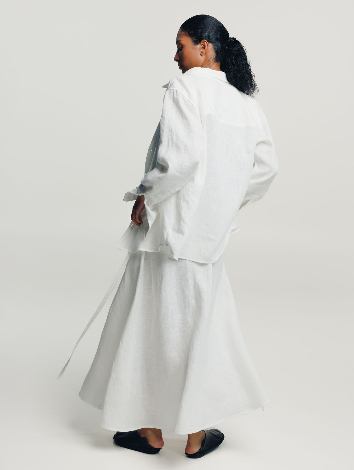 Klassinen pitkähihainen pellavapaita naisten mitoituksella. Kaulus, napitus edessä ja hihansuissa. Hieman pyöristetty helma, sekä selkäpuolella kaarroke ja laskos.