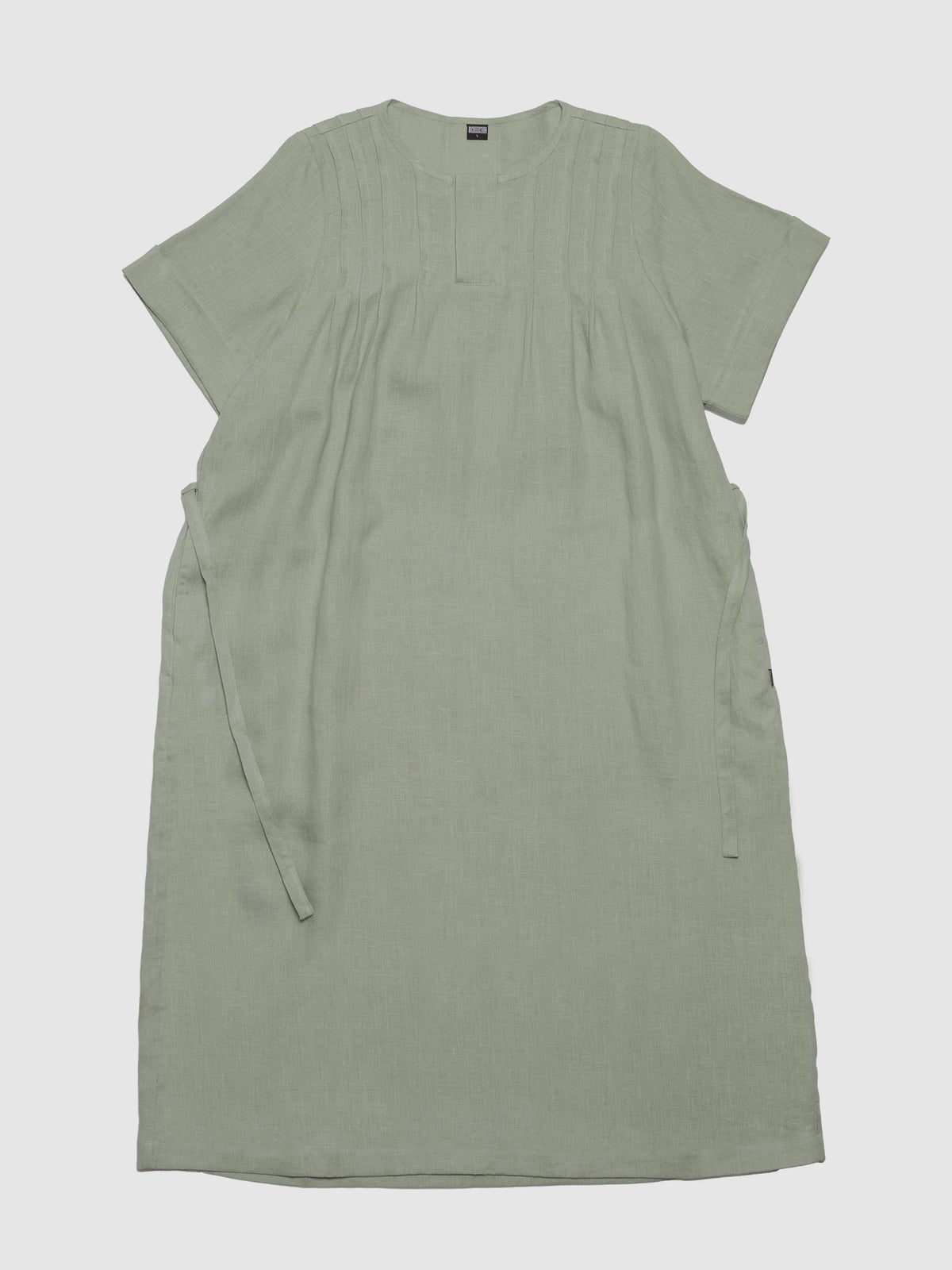 Pellavasta valmistettu rento pohjepituinen Hehku-mekko. Edessä piilonappilista, taskut sivusaumoissa, käännetyt hihansuut ja olkapäissä ja pääntiellä laskokset. Mukana samasta kankaasta valmistettu vyö.