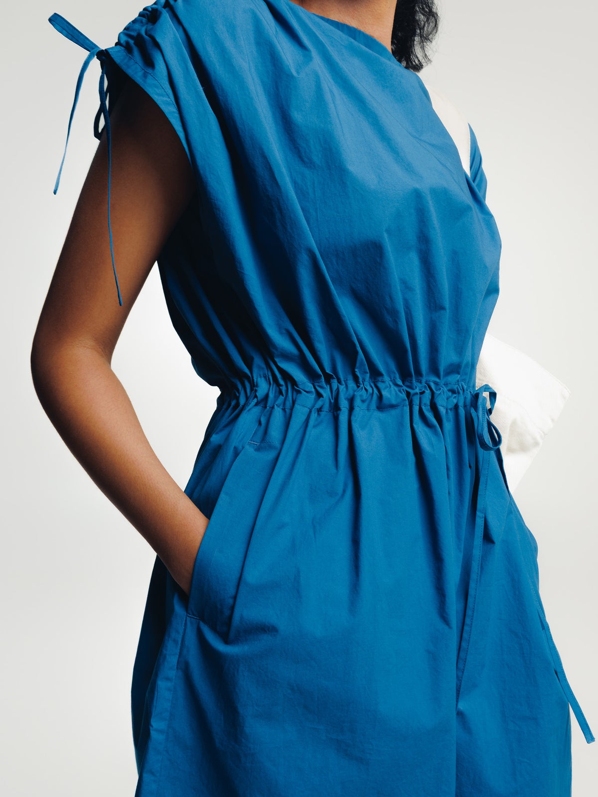 Luomupuuvillakankaasta valmistettu naisten kesämekko. Pääntiellä sekä olalla ja vyötäröllä nyörikiristykset. Nyörien avulla pystyy säätämään vene-pääntien sekä hartialinjan leveyttä ja mekon istuvuutta. Taskut sivusaumoissa.