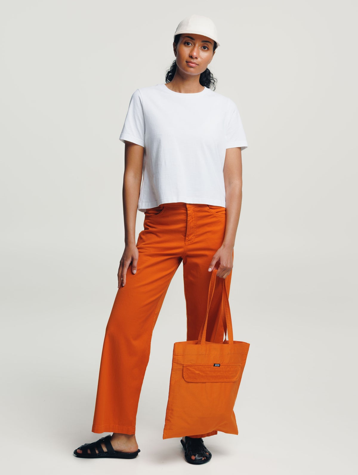 Puuvillasekoitetvillistä valmistetut naisten korkeavyötäröiset housut. Pitkät suorat lahkeet, vetoketjusepalus ja taskut edessä sekä takana.