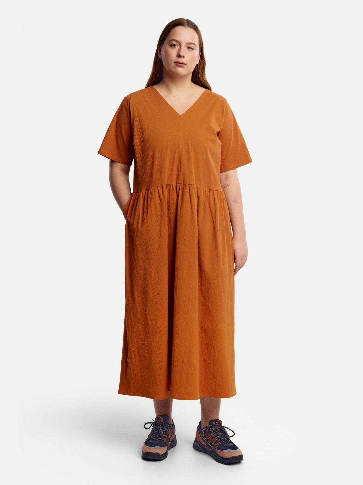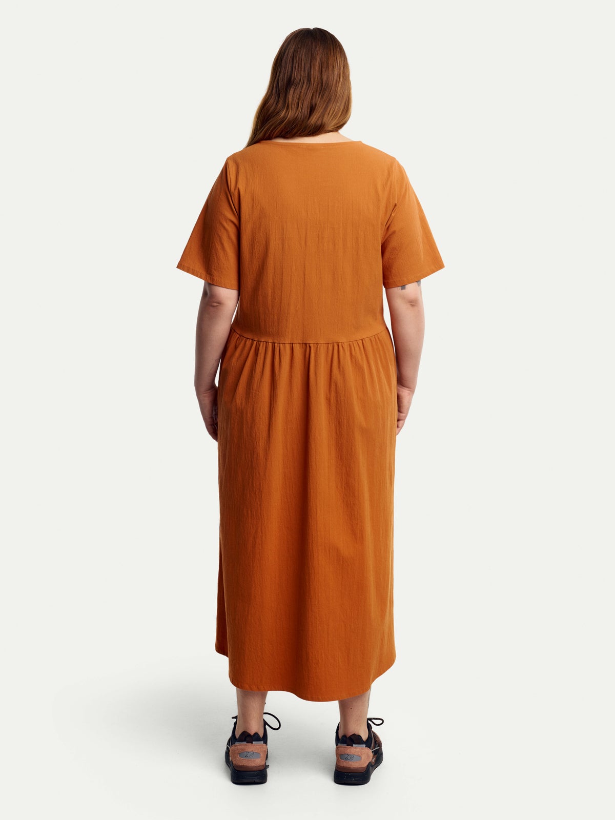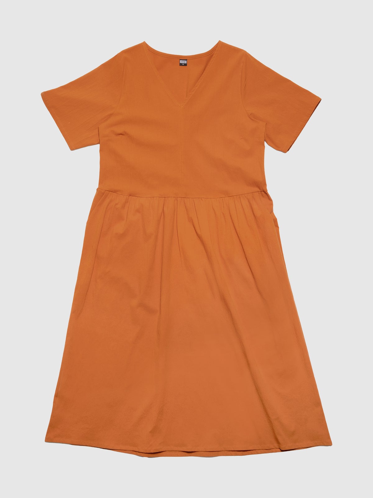 Rento naisten kesämekko, valmistettu joustavasta kreppikankaasta. Vyötäröllä leikkaus ja rypytys sekä viistotaskut edessä.