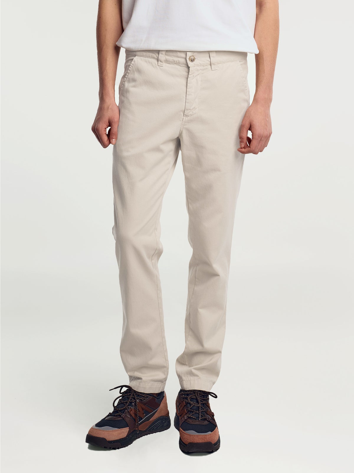 Miesten rennot chinot. Hieman alaspäin kapeneva malli. Edessä nappi ja vetoketjukiinnitys. Viistot taskut. Vyötäröllä vyölenkit. Takana listataskut napeilla ja muotolaskokset.