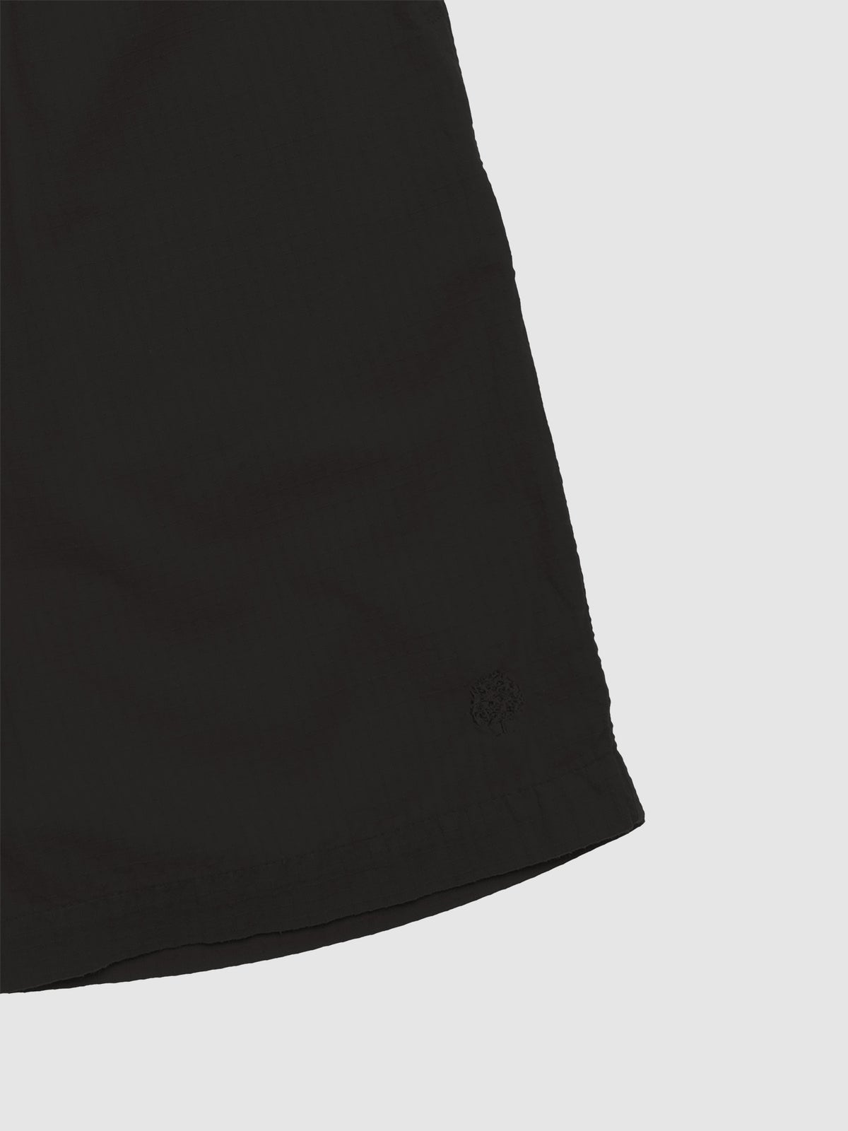 Puuvilla-pellavasekoitteesta valmistetut rennot shortsit. Unisex-mitoitus, joustovyötärö nyörillä, viistotaskut, puubrodeeraus ja paikkataskut takana.
