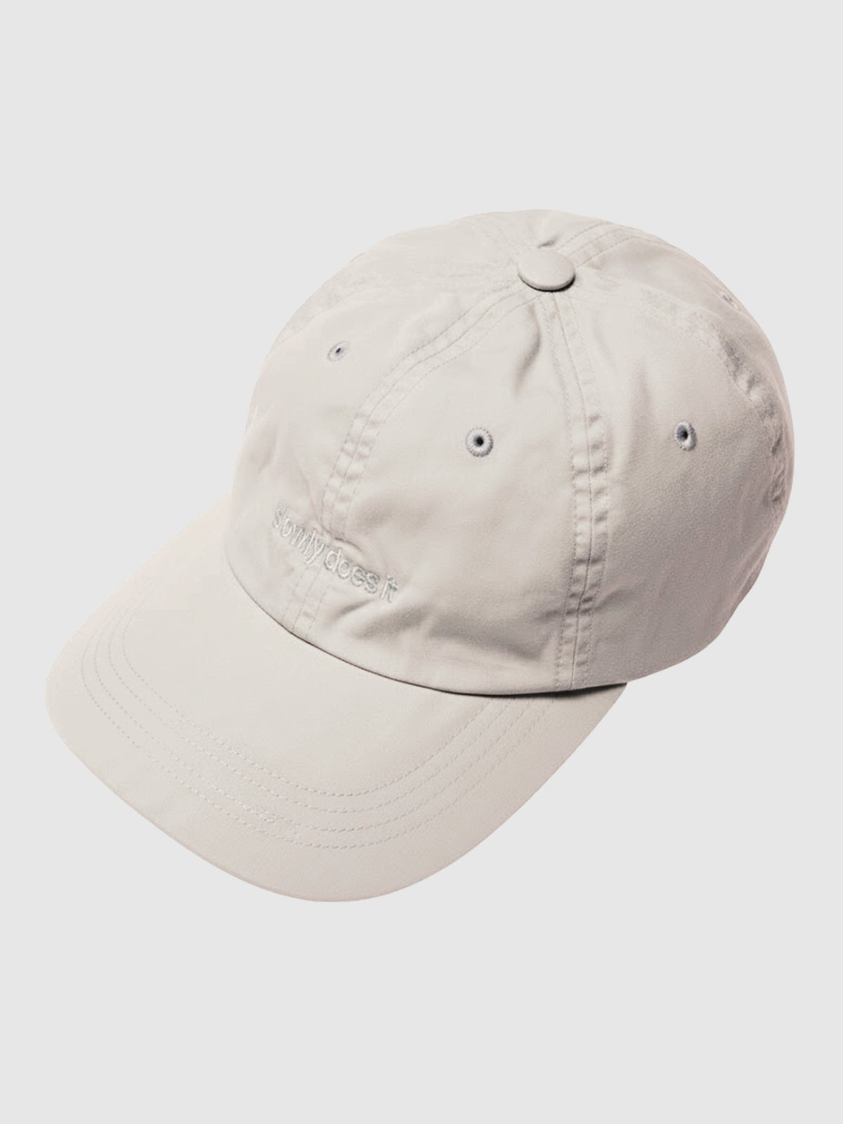 Miesten mitoituksella tehty 6-paneelilippis. Slowly does it -brodeeraus edessä. Takana metallisolkinen säätötamppi.