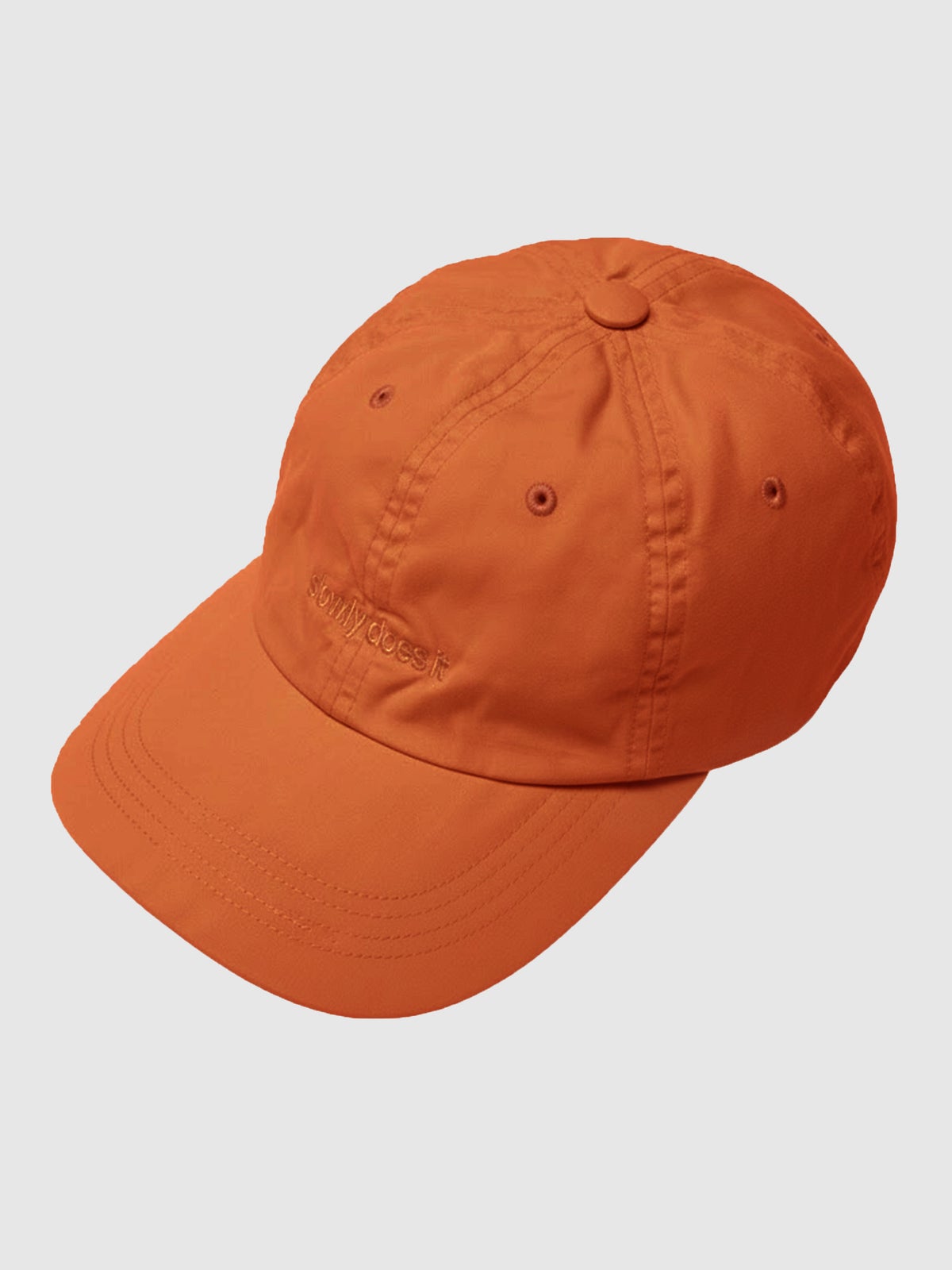 Miesten mitoituksella tehty 6-paneelilippis. Slowly does it -brodeeraus edessä. Takana metallisolkinen säätötamppi.